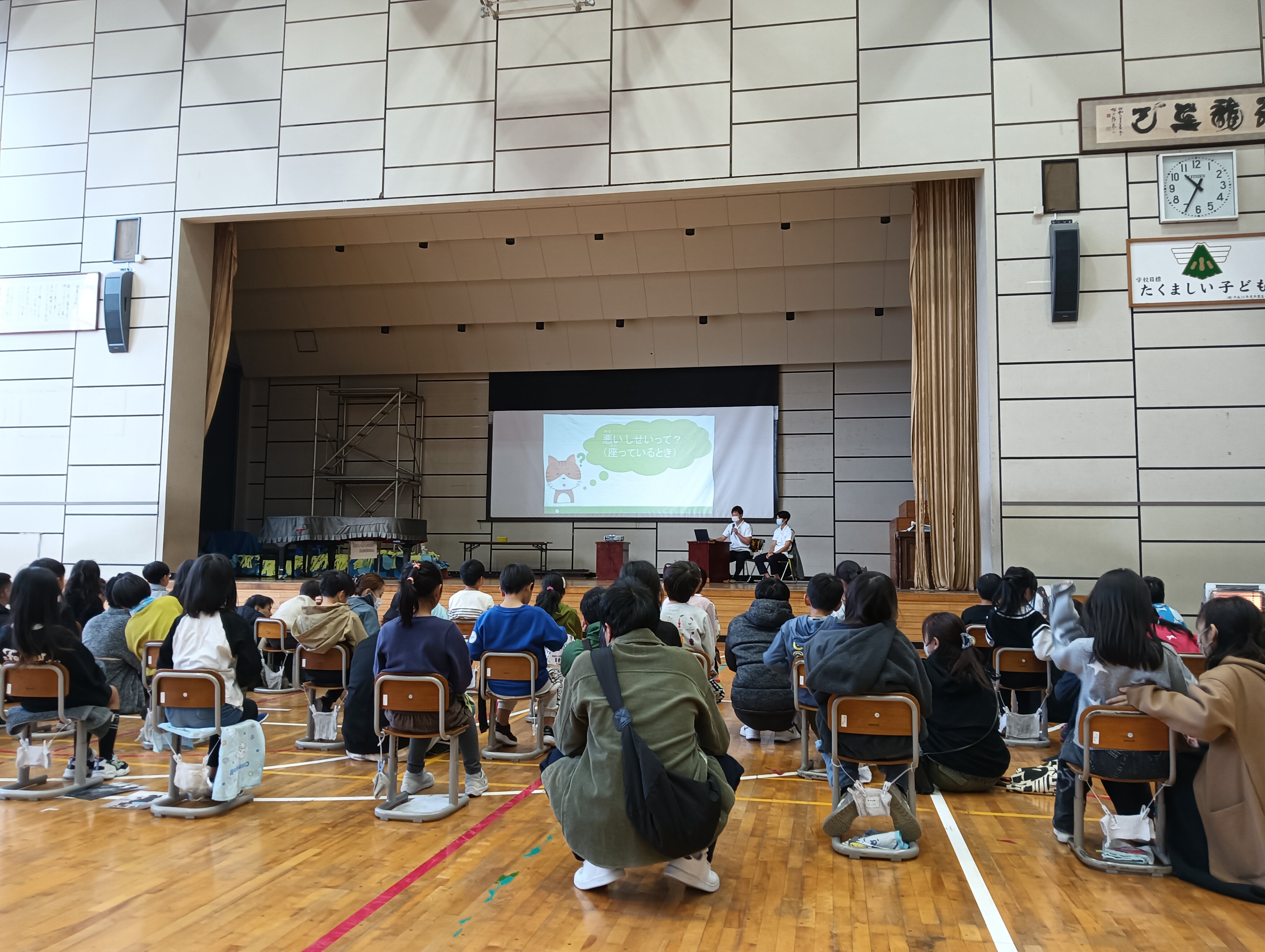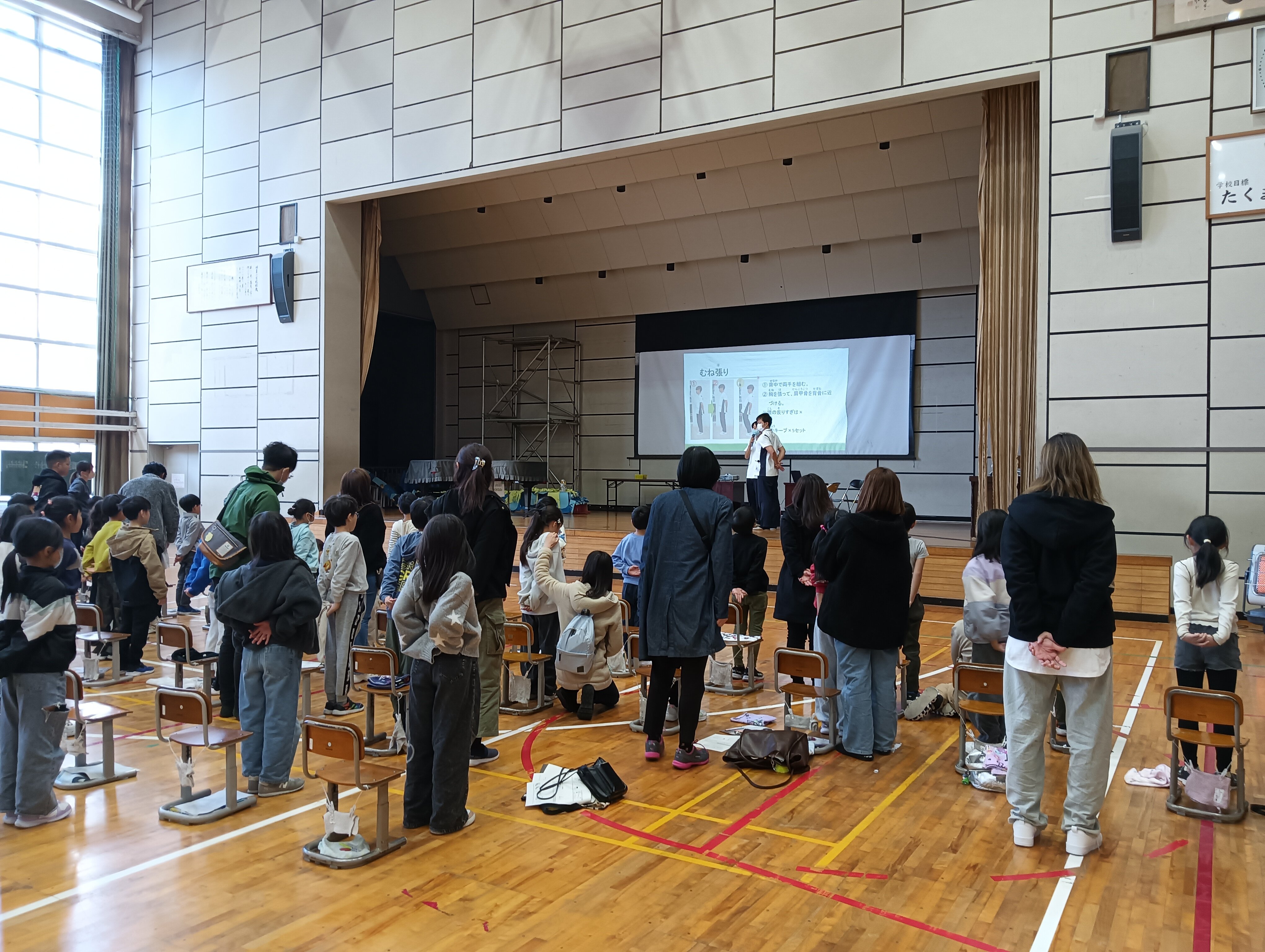 11月8日に川岸小学校へ保健講話に行ってきました。今回のテーマは、岡谷田中小学校に引き続き、「しせいの話」をテーマに、当科の濵理学療法士と飯島理学療法士が講師を務めました。今回は授業参観の時間で、児童・保護者の方一緒に、自分の姿勢について確認することができました。