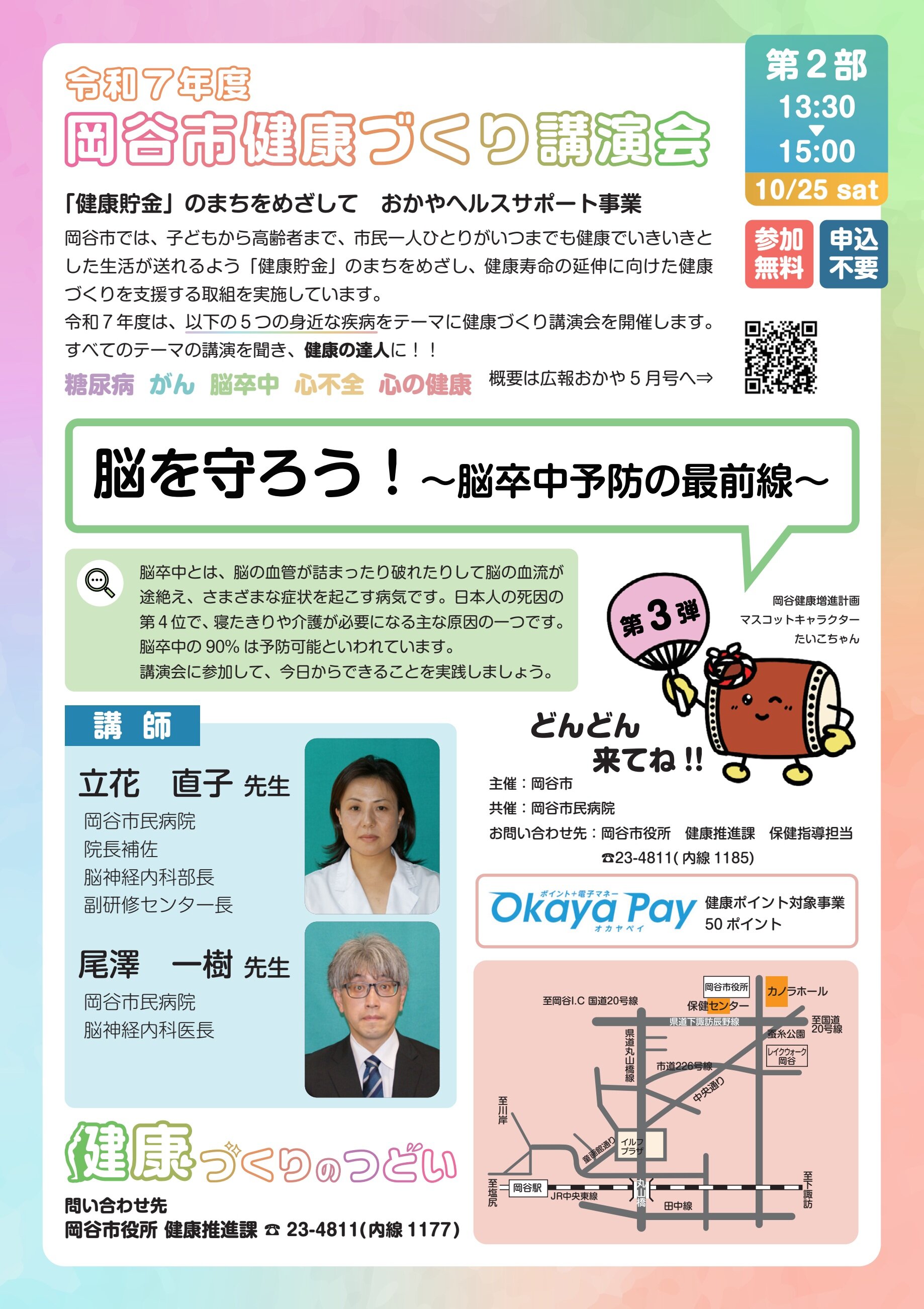 岡谷市が主催する「おかやヘルスサポート事業」として、令和7年度は、5大疾病をテーマに健康づくり講演会を実施します。当院院長補佐、脳神経内科部長の立花 直子 医師、脳神経内科医長の尾澤 一樹 医師による講演を行います。参加無料、申込み不要で、市民に限らずどなたでもご参加いただけます。ぜひ、お誘いあわせのうえご参加ください。