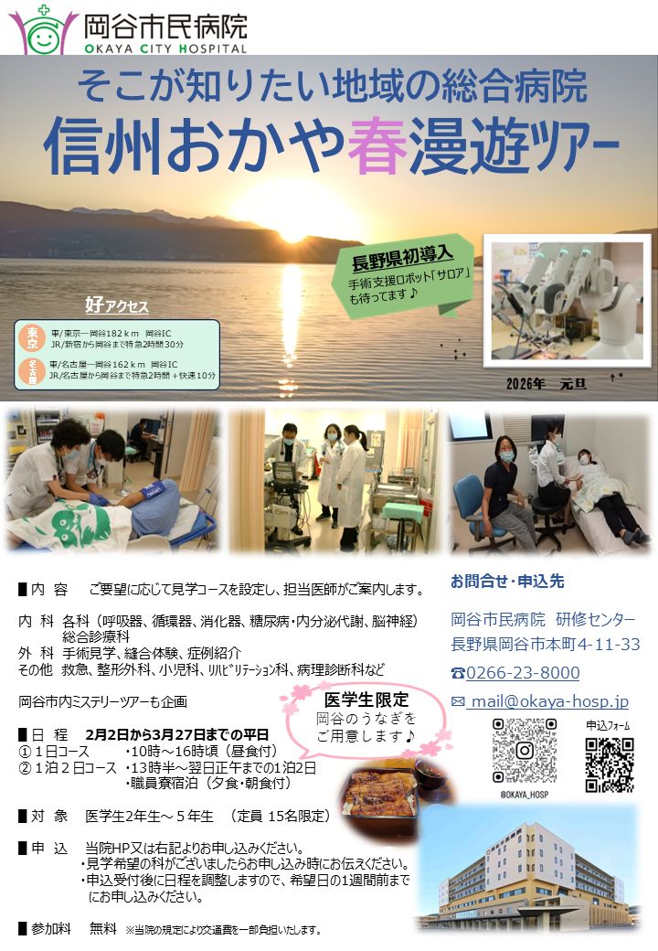 医学生限定「そこが知りたい地域の総合病院 信州おかや春漫遊ツアー」開催いたします。2月2日(月)~3月27日(金)までの平日にご希望に応じた内容の病院見学を承ります。病院見学申し込みフォームよりお申し込みをお待ちしております。